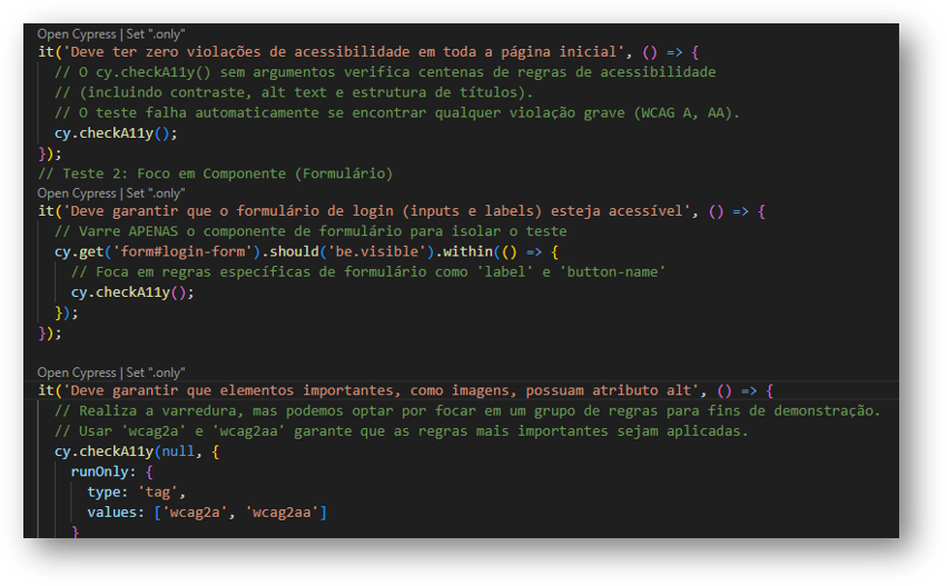 Cypress + plugins de acessibilidade: além do Cypress, existem diversas ferramentas no mercado que integram com a biblioteca Axe. O diferencial aqui é que, diferente dos scanners “estáticos”, os scripts automatizados permitem testar acessibilidade em fluxos reais (ex: fazer login). Os comandos são simples e possibilitam validar páginas ou componentes específicos automaticamente.